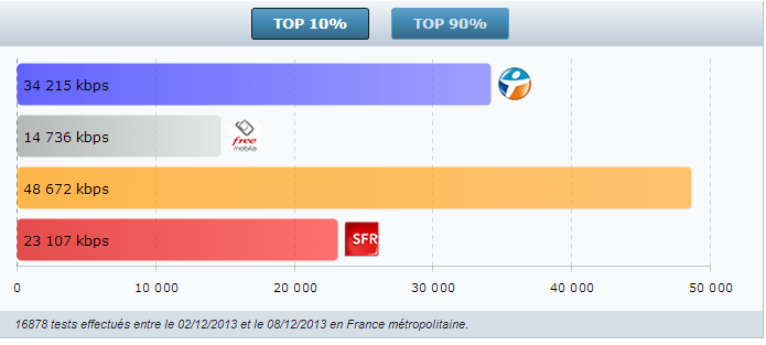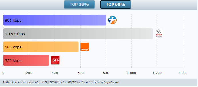 Autre amélioration notable, "le top 10 %", débit minimal atteint pour 10 % des connexions : ce dernier gagne 4 Mbits en une semaine passant de 10,3 Mbits à 14,4 Mbits. Une performance qui reste modeste quand ses concurrents tournent à 23 Mbits (SFR), 34 Mbits (Bouygues) ou 48 Mbits (Orange).