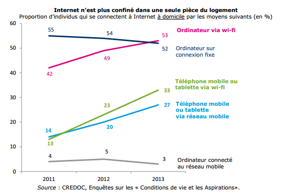 Parmi les usages, l’usage du Wi-fi est également en augmentation que ce soit sur Ordinateur (+4 points) et sur téléphone mobile ou tablette (+10 points).