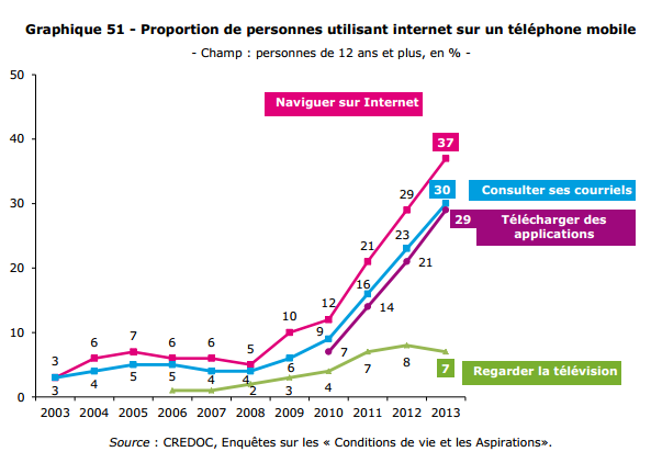 L’ensemble des usages d’internet sur téléphone mobile sont en augmentation de plus de 7 points sauf l’usage de la télévision sur mobile qui stagne autour de 7 % d’utilisateurs.