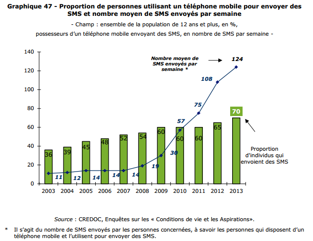 L’usage du SMS continue sa démocratisation. La généralisation des forfaits disposant des SMS illimités dans les forfaits et l’arrivée de Free Mobile sur le marché le nombre de SMS envoyé par les utilisateurs par semaine à explosé avec une moyenne de 124 SMS envoyés par semaine et par abonné.