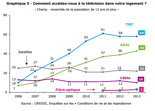 La connexion à la télévision reste stable via la TNT, le câble ou le satellite, mais reste en constante augmentation via l’ADSL,, la télévision via une offre fibre optique reste très faible (3%).