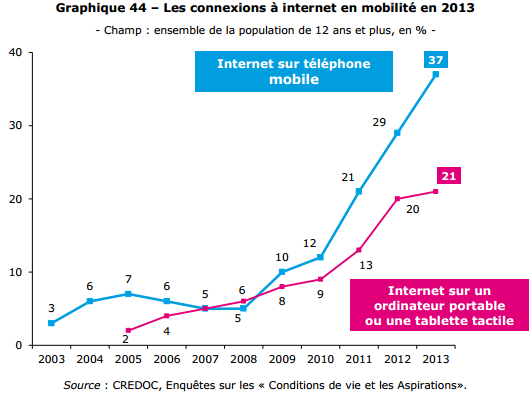 Parmi les Français interrogés par cette étude, ils ne sont qu’un peu plus d’un tiers (37%) à se connecter à internet en mobilité via un téléphone mobile, et 21 % via un ordinateur portable ou une tablette.