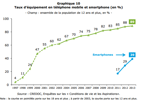 Concernant les équipements mobiles, 89 % des Français disposent d’un terminal mobile (+1 points). Néanmoins, à l’heure du déploiement massif de la 4G, seuls 39 % des Français disposent d’un Smartphone. Une proportion qui est nettement plus forte pour les 18-24 ans (75%) et qui tombe à moins de 10 % pour les plus de 70 ans.