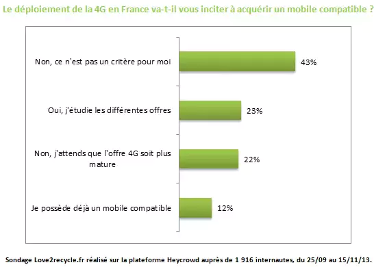 Mais pour près de la moitié des Français (44%) le déploiement de la 4G ne va pas vraiment les inciter à acquérir un mobile 4G. 22 % des Français attendent également que l’offre 4G soit plus mature pour se décider soit 65 % des Français qui ne se tourneraient pas vers la 4G pour le moment.