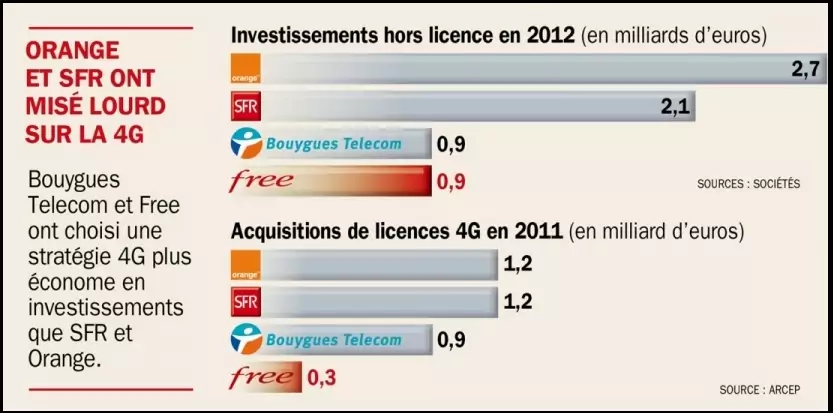 C’est donc Orange qui a investi le plus, malgré un réseau fixe très développé. Tout comme SFR, il a du transformer ses sites pour faire de la 4G et les relier en fibre optique ou par faisceaux hertziens. Ce montant s’explique également par le fait que l’opérateur historique a acheté une partie de ses équipements chez Alcatel qui est réputé plus cher.