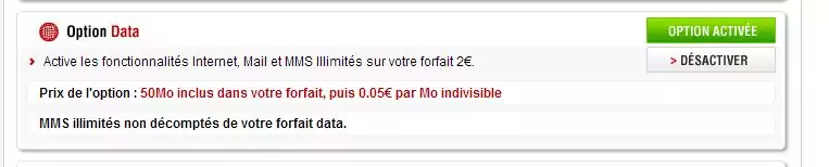 Une petite polémique avait été lancée lors de l’annonce de ce forfait au sujet des possibles dépassements générés par l’ajout de la data. Cependant, comme on peut le constater depuis aujourd’hui sur l’interface des abonnés qui bénéficient de ce nouveau forfait 2€, Free offre la possibilité de bloquer l’option data depuis l’interface abonné Free Mobile. Cette option (qui existait également auparavant dans l’ancien forfait 2€ mais qui était payante et avec moins de data) peut être activée ou désactivée à loisir et gratuitement par l’abonné, et il est donc possible de le faire une fois les 50 Mo inclus consommés pour éviter le hors forfait. Attention cependant, à partir du moment où vous bénéficiez de ce nouveau forfait 2 euros (ce qui est le cas des abonnés actuels dès la fin de leur cycle mensuel de facturation), l’option data est activée par défaut.
