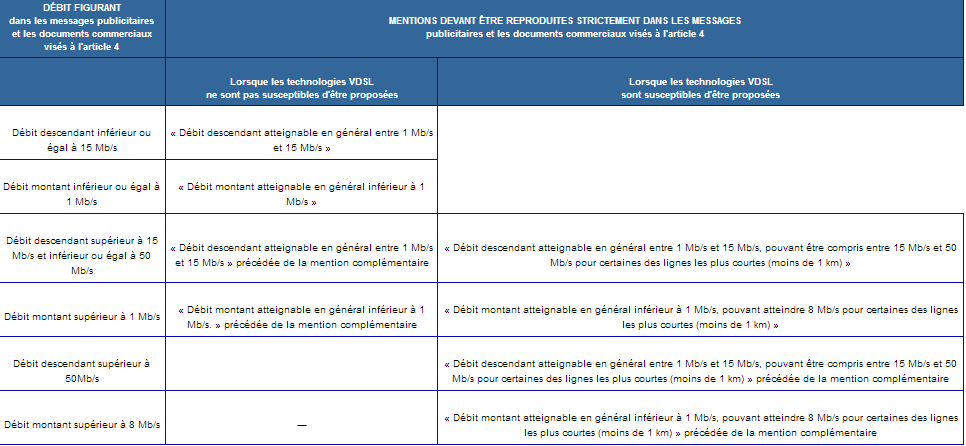 Ainsi l’arrêté prévoit dans son article 4 que "tout message publicitaire ou document commercial d’un fournisseur de services, dès lors qu’il mentionne un débit, précis si ce dernier est un débit montant ou descendant."