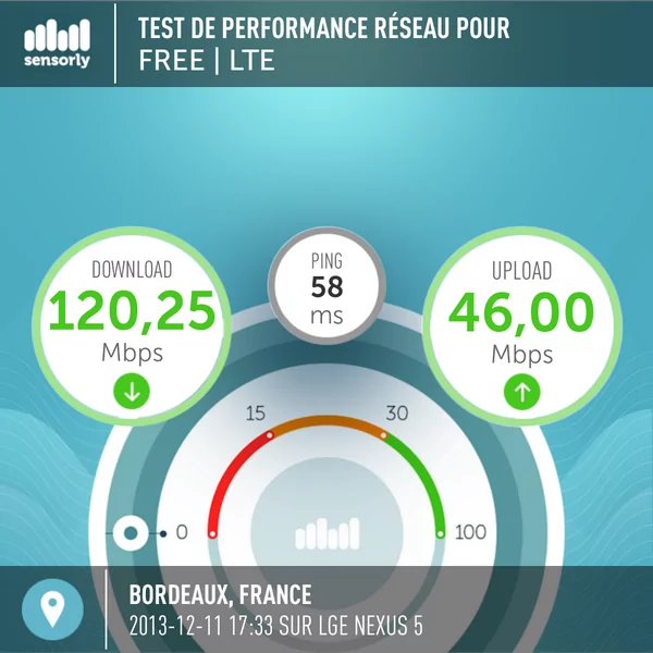 Vache GTI, Freenaute et lecteur d’Univers Freebox vient de battre le record du plus fort débit descendant avec 120,25 Mbits, un ping de 58 Ms et un débit montant de 46 Mbits. Ce test a été réalisé avec un Nexus 5, avec l’application Sensorly, sur Bordeaux.