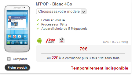 Le second est un téléphone bas de gamme signé Alcatel, le One Touch M’Pop est un smartphone vendu 79 €, en 4 ou 12 fois sans frais. Il permet ainsi d’offrir ou de s’offrir un téléphone 3G sous Android pour moins de 100 € ou à 6,50 € par mois.