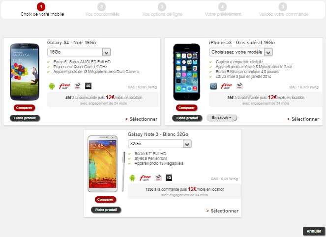 Dans un deuxième temps, vous aurez à choisir entre les 3 types de terminaux proposés en l’occurrence, l’ iPhone 5S, proposé uniquement dans sa version 16 Go, le Samsung Galaxy S4 également dans sa version 16 Go et le Samsung Galaxy Note 3 en 32 Go. Pour l’iPhone vous aurez le choix entre trois coloris (or, gris sidéral ou argent), pour les deux autres vous aurez le choix en noir et blanc.