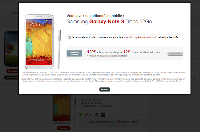 Une fois le choix de votre mobile réalisé, une première validation des "conditions générales de location" est nécessaire. Le prix de location y est rappelé ainsi que le tarif du smartphone en cas de résiliation anticipée avant l’échéance des 24 mois.