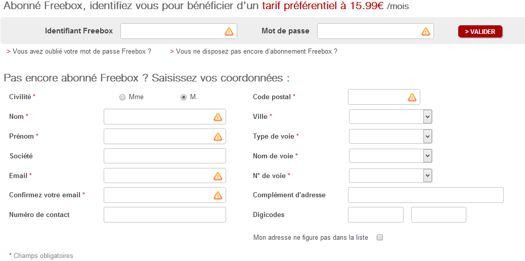 - Enfin, pour ceux qui ne sont pas abonnés Freebox, il vous faudra renseigner tous les champs obligatoires de vos coordonnées. C’est à cette adresse que vous sera envoyé le terminal et la carte sim.