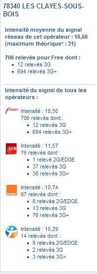 Concernant les résultats, ils sont également très variables d’une ville à l’autre, même si ses dernières sont voisines. Si dans certaines villes et département, Free est moins bien classé que ses concurrents, dans d’autres comme dans le 20e arrondissement de Paris, il se classe premier.