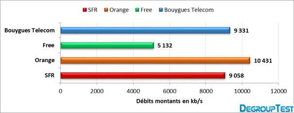 Même chose sur le débit montant. Alors qu’Orange, SFR et Bouygues Telecom se tiennent dans un mouchoir de poche avec des moyennes respectives de 10,43 Mb/s, 9,1 Mb/s et 9,3 Mb/s, la moyenne des débits montants de Free est environ 50% inférieure avec 5,13 Mb/s.