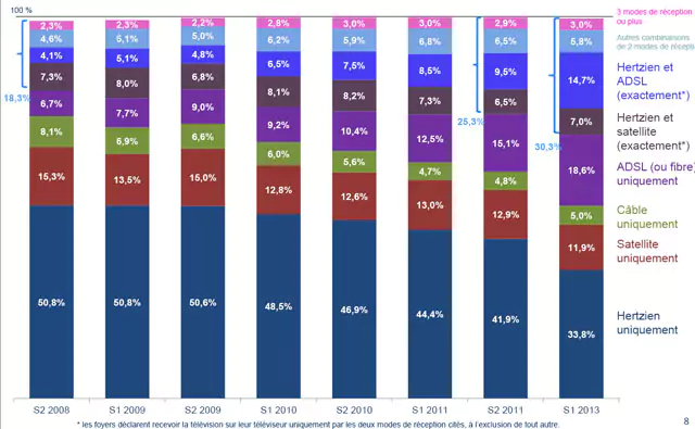 Cette nouvelle étude montre que la télévision par ADSL a continué à progresser au 1er semestre 2013, alors que l’utilisation d la TNT ou du satellite a baissé. A cette allure, la télévision par ADSL sera le premier mode de réception en France dans les prochaines années