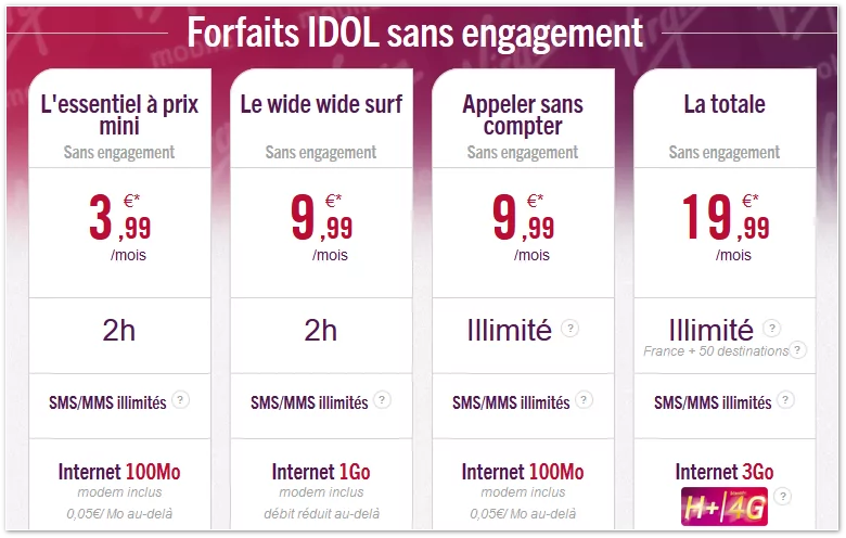 Dorénavant, l’offre « IDOL (S) Illimité 3Go » inclut les appels en illimité vers la France, les appels en illimité vers 52 destinations internationales (fixes et mobiles ou seulement vers les fixes selon les destinations), les SMS/MMS en illimité et 3Go de data en H+ (jusqu’à 42 Mbps). Dès le printemps, les abonnés pourront, sur demande depuis leur espace client, profiter de la 4G. Le Full MVNO a signé plusieurs accords avec Bouygues Télécom et SFR (pour utiliser leurs réseaux). Les abonnés disposeront ainsi d’une certaine couverture.