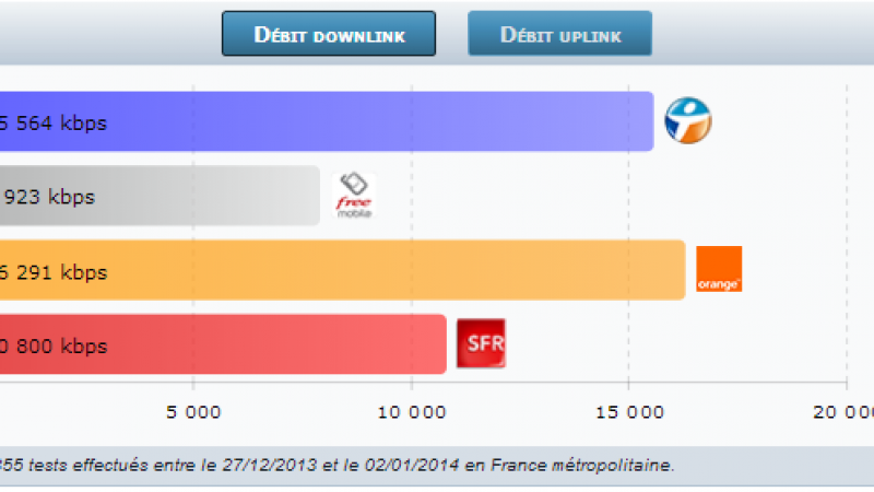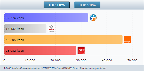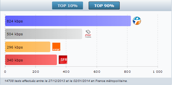 Quant au Top 90 % l’ensemble des opérateurs sont désormais sous la barre de 1 Mbits. Free qui avait affiché de belles performances à son lancement voit son débit pour 90 % des connexions divisé par deux à 500 Kbits. Il reste deuxième en performance derrière Bouygues stable à 800 Kbits, SFR (340 kbits) et Orange dont les performances ont également été divisées par deux(296 kbits).
