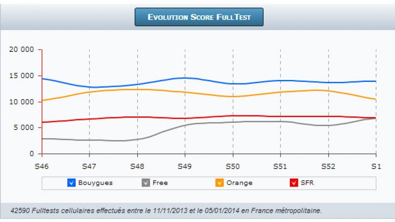 La courbe des dernières semaines montre en effet que le score de Free Mobile est en constante progression, notamment depuis le lancement de la 4G, et que s’il était bon dernier il y a quelques semaines, il fait désormais quasiment jeu égal avec SFR, avec un score de 6694. C’est encore loin de celui d’Orange et de Bouygues, mais le score de Free Mobile devrait continuer à progresser dans les prochaines semaines, avec notamment l’activation de la 4G sur les iPhones 5C et 5S.