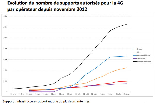 – Au 1er janvier 2014, 12 525 sites ont été autorisés pour la téléphonie mobile très haut débit (4G) tous opérateurs confondus. Ce chiffre est en hausse d’environ 3,8% depuis le 1er décembre 2013.