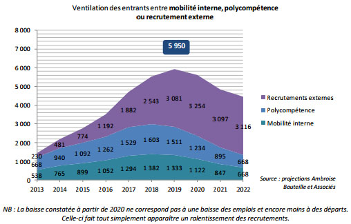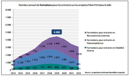 Les recrutements annuels (externes et internes), nécessaires à la dotation à terme des plus de 19 000 emplois (équivalents temps plein), culminent à près de 6 000 personnes en 2019. L’étude précise qu’il ne s’agit pas uniquement de collaborateurs issus de recrutements externes mais également de collaborateurs issus de la mobilité interne (cas des grandes entreprises) ou de la polycompétence (cas des petites entreprises affectant une part du temps de leurs techniciens « cœur de métier » sur la fibre optique).