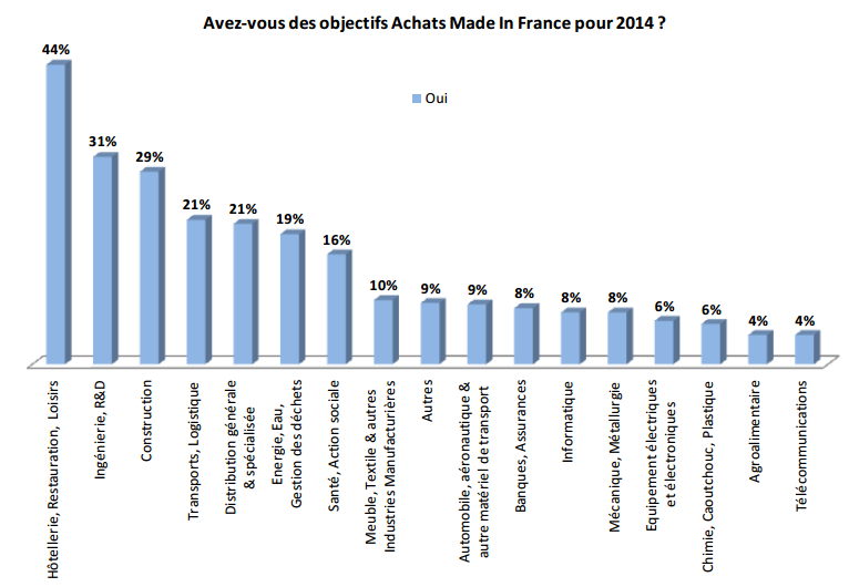 Une chose est sûre, le "Made In France" n’est pas une priorité dans leurs achats bien au contraire, seuls 13 % d’entre eux annoncent avoir des objectifs d’acheter français… Loin des promesses qu’ont du faire les quatre opérateurs de téléphonie à monsieur "Made In France" Arnaud Montebourg, le ministre du Redressement productif aura bien du mal à leur imposer le patriotisme économique dans les télécoms. Seuls 4% des répondants ont un objectif d’Achat Made In France pour 2014 pour leurs achats en télécommunications, le pire objectif d’achat des différents secteurs représentés.