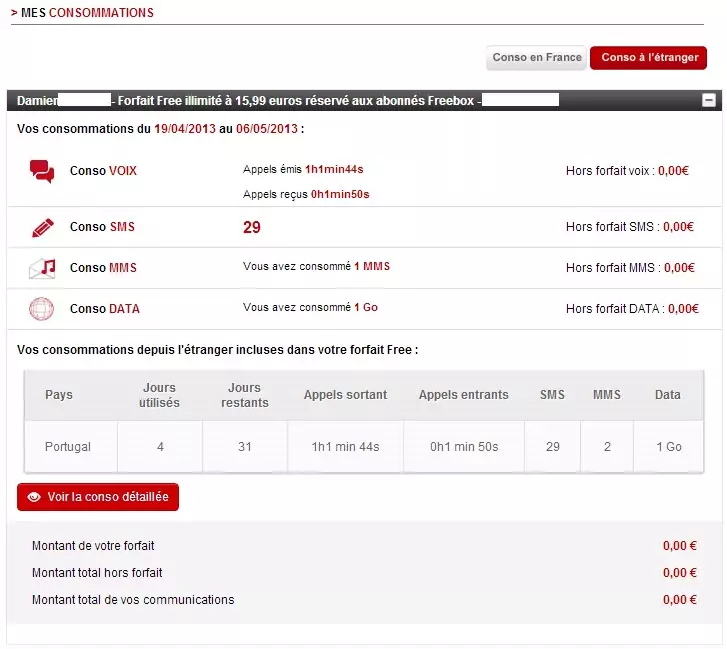 Afin de savoir si les 35 jours ont déjà été utilisés, et quelle a été la consommation lorsque l’abonné se trouve dans les Antilles ou en Guyane, Free ajoute un nouveau tableau spécifique dans le suivi conso de l’interface abonné. Voici comment cela se présente pour le « Pass Destination Portugal »