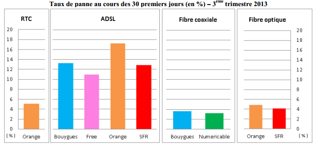 Corcernant les pannes rencontrées dans les 30 premiers jours. Free progresse d’un point par rapport au trimestre précédent avec seulement 11 % de pannes dans le premier mois. Free reste numéro 1 à ce titre présentant le taux de panne le plus faible. SFR et Bouygues tournent autour de 13 %, 17% pour Orange. La fibre optique présente un taux de panne plus faible 4/5 % et moins de 4% pour le câble coaxial.
