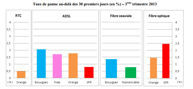 Au delà de ces 30 jours, SFR affiche une belle progression dans l’ADSL avec moins de 1% de panne (2,5 % dans la fibre optique), entre 1,5 et 2 % pour Orange et Free, 2 % pour Bouygues. Numericable est également sous la barre des 1%