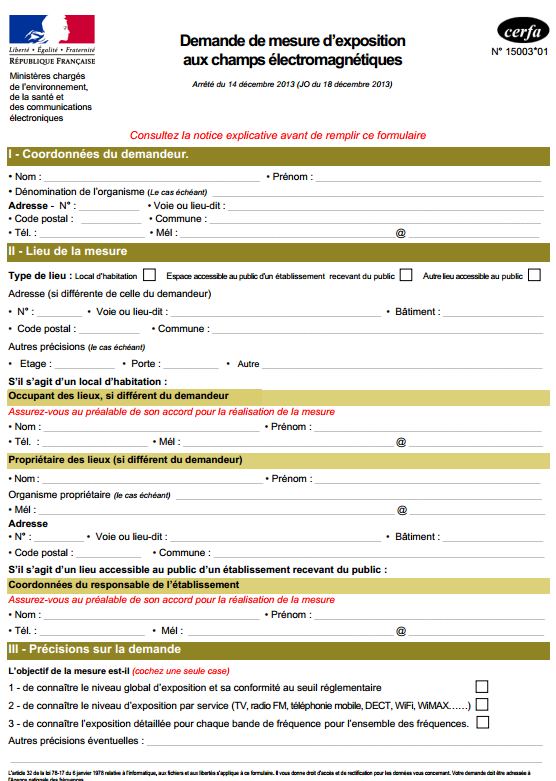 Toute personne "Morale" peut désormais solliciter une mesure d’ondes électromagnétiques dans les lieux accessibles au public ou dans les locaux d’habitation en téléchargent le formulaire.