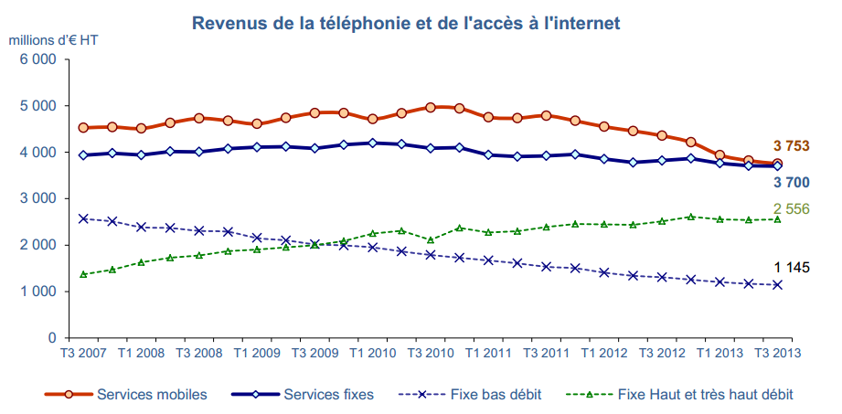 Concernant les revenus des opérateurs, l’ARCEP note une baisse de revenus généralisée au 3e trimestre 2013 de 3,1 % pour les services fixes et 13,8% pour les services mobiles par rapport au 3e trimestre 2012. La baisse de revenu des opérateurs sur le marché final est estimée à 8,2 % pour un revenu estimé à 9,3 milliards d’euros.