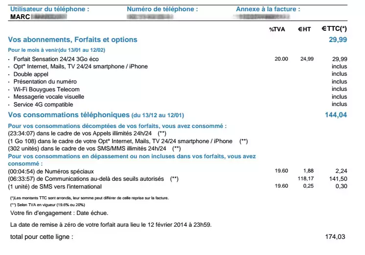 N’ayant pas vraiment le choix puisque Marc a besoin d’utiliser son téléphone jusqu’à la fin du mois d’abonnement, sa surprise et sa colère a été grande au moment de recevoir sa facture. En effet, celle-ci a atteint pour son premier mois d’abonnement, la somme de 174,03 euros ! Les seules consommations en France, au delà « du seuil autorisé » lui ont été facturées 141,50 euros, pour 6h30 de communications.