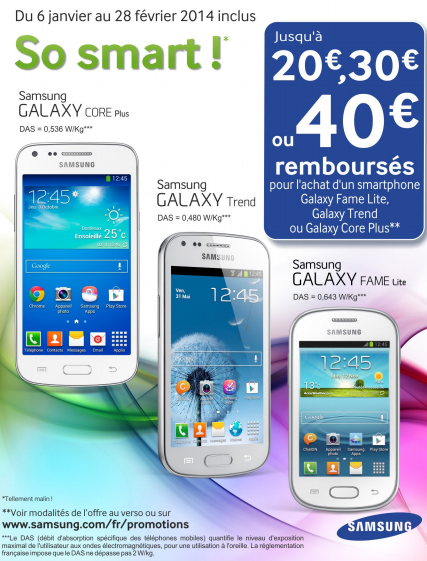 La Samsung Galaxy Fame Lite, dernier né de la boutique bénéficie d’une offre de remboursement de 20 € jusqu’au 28 février 2014 en suivant la procédure de remboursement disponible sur ce lien. Le prix du téléphone vendu 109 € peut donc tomber à 89 €.