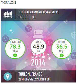 Côté débit max, Toulon affiche 78,3 Mbits enregistré samedi 25 janvier à 12h52 avec un LG. Un score qui le place la aussi 15 ème devant Strasbourg et Reims.