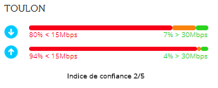Côté débit max, Toulon affiche 78,3 Mbits enregistré samedi 25 janvier à 12h52 avec un LG. Un score qui le place la aussi 15 ème devant Strasbourg et Reims.