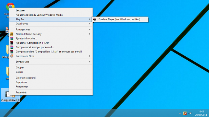 Connecté en Wifi, un clic droit avec la souris, sur la photo et/ou la vidéo de votre choix et vous retrouverez la fonction "Play To" vous permettant d’envoyer le fichier en lecture sur votre télévision en passant par la Freebox.