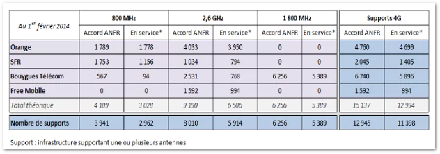 Au niveau national, 12 945 sites ont été autorisés au 1er février 2014 pour la téléphonie mobile très haut débit (4G) tous opérateurs confondus. Ce chiffre est en hausse d’environ 3,4 % depuis le 1er janvier 2014. En France, trois bandes de fréquences permettent de fournir un service 4G : La bande 800 MHz, la bande 1 800 MHz et la bande 2,6 GHz (celle qu’utilise Free pour offrir à ses abonnés des débits pouvant atteindre 150Mb/s en réception).