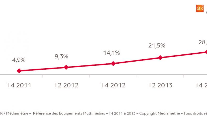 Les fêtes de Noël ont encore donné un coup d’accélérateur aux tablettes : à fin 2013, 7,9 millions de foyers sont équipés d’une tablette, soit près de 3 foyers sur 10. Une progression de plus de 30% par rapport au 2ème trimestre 2013 et 6 fois plus qu’en 2011. C’est ce qui ressort de l’étude sur la Référence des Equipements Multimédias que viennent de publier GfK et Médiamétrie