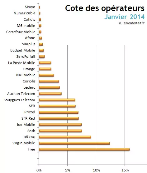 Le site de comparateur de forfaits lebonforfait.fr a publié sa côte des opérateurs mobiles pour le mois de janvier. Ces statistiques sont basées sur le taux de consultation des offres de chaque opérateur, sur 35 000 consultations entre le 1er janvier 2014 et le 31 janvier 2014.