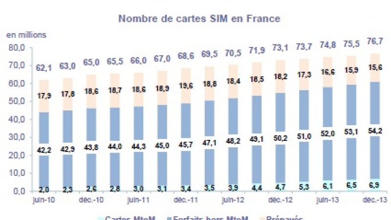 L’ARCEP vient de publier son observatoire trimestriel des services mobiles au 4ème trimestre 2013. Le nombre de cartes SIM en circulation continue d’augmenter pour atteindre 76,7 millions de cartes SIM en France fin décembre 2013 soit 1,242 millions de cartes SIM de plus qu’en septembre 2013.