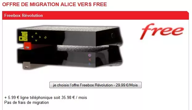 Jusqu’à présent seule la migration d’Alice vers la Freebox V5 (ou Crystal) était gratuite, la migration vers la V6 vous était facturée 49 €. D’après les tests d’Univers Freebox ce matin, désormais la migration d’Alice ADSL vers la Free Box Révolution se réalise également gratuitement :