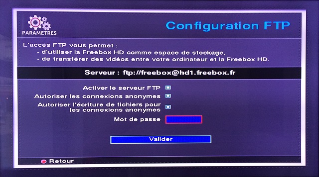 Mot de passe : Celui que vous avez configuré depuis la Freebox