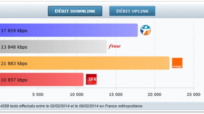 Orange prend la tête du classement avec 21,8 Mbit/s en réception. Suivi par Bouygues Télécom avec 17,81 Mbit/s. Free Mobile se classe devant SFR avec une moyenne de 13,4 Mbit/s. L’opérateur au Carré Rouge arrive dernier avec 10,8 Mbit/s.