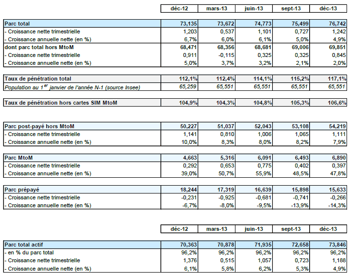 La croissance est portée par l’augmentation du nombre de forfaits : le nombre de clients ayant souscrit un forfait classique atteint à 54,2 millions, en croissance de 1,1 million en un trimestre. Le nombre de forfaits MtoM (6,9 millions au 31 décembre 2013) a progressé de 400 000 en un trimestre. En revanche, le nombre de cartes prépayées en service continue de diminuer : le repli est de 266 000 en un trimestre et de 14,3% en un an.
