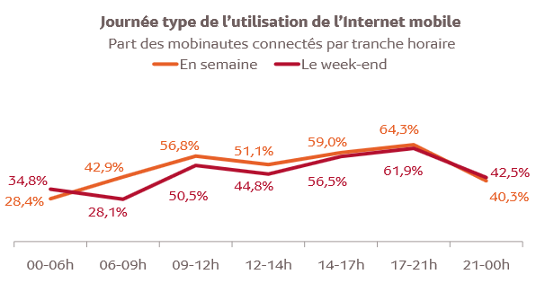 Quant aux heures d’utilisation, Médiamétrie note un pic d’utilisation en début de soirée avec 61 % de mobinautes connectés entre 17h et 21h.