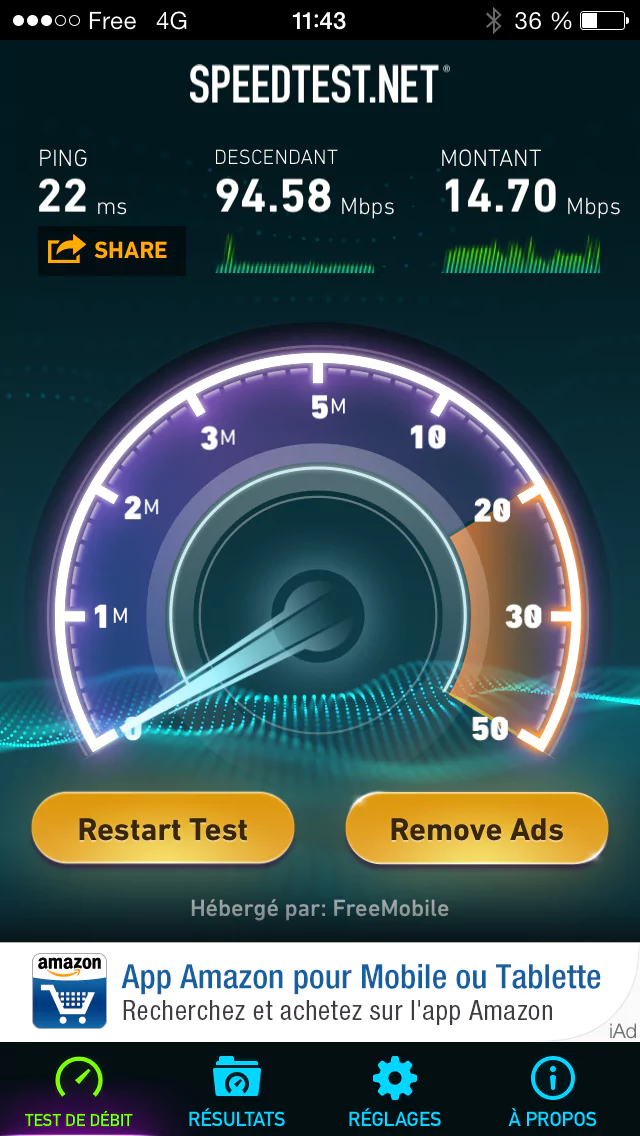 Décidément ,les nancéiens sont nombreux à nous envoyer leurs captures d’écran de leurs tests de débit 4G Free Mobile. Alors qu’hier l’un de nos lecteurs enregistrait un débit de 92.97Mbps, aujourd’hui un Freenaute atteint 94.58 Mbps, c’est donc un nouveau record pour Nancy. Nous vous rappelons que dans cette même ville un score de 110Mbps a été atteint par un Freenaute (celui-ci n’avait cependant plus la capture d’écran).