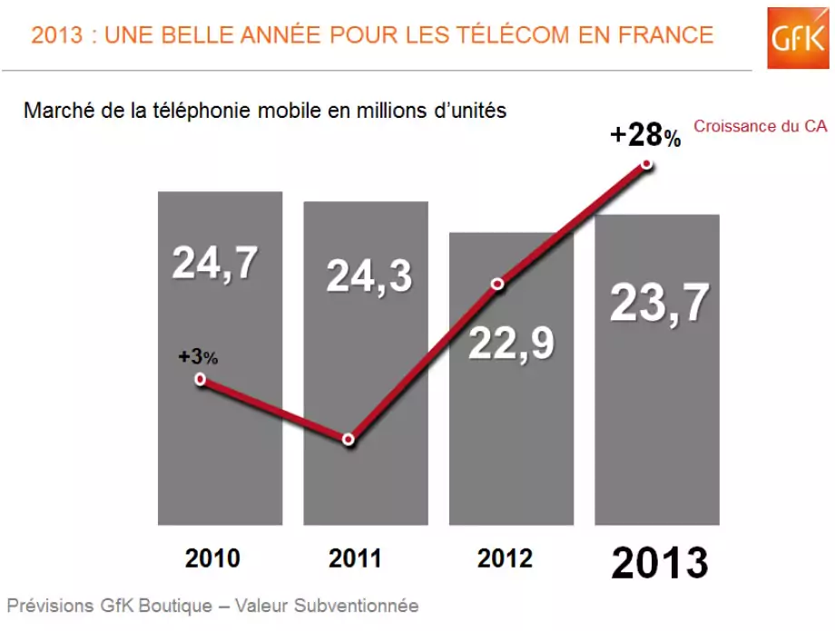 Gfk vient de publié son bilan 2013 des marchés des biens techniques en France et en particulier le marché des téléphones mobiles.