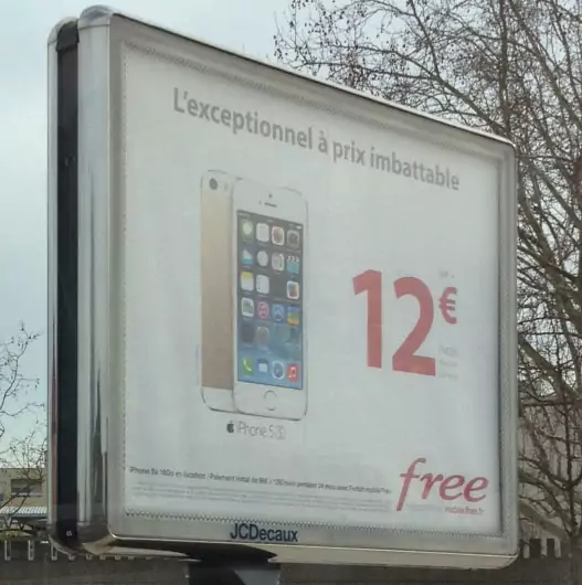 Lancée en décembre, cette nouvelle offre fait donc l’objet d’une campagne publicitaire. Sur la photo de l’affiche prise à Metz que nous a envoyée un Freenaute, on peut voir un iPhone 5s accompagné du slogan : « l’exceptionnel à prix imbattable » et le tarif de la location mensuel