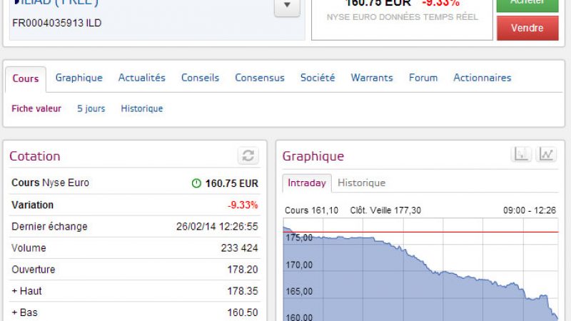 A peine l’action Iliad a-t-elle récupéré sa valeur d’avant les propos de Martin Bouygues sur sa déclaration de guerre à Xavier Niel, qu’elle reperd ce matin près de 10% (9,33% à 12h30).