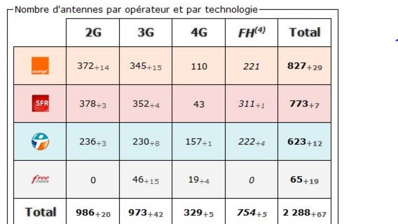 (4) FH (faisceau hertzien) : Système de transmission entre les antennes relais. N’est jamais directement capté par un mobile. (chiffre non comptabilisé dans le total des antennes)