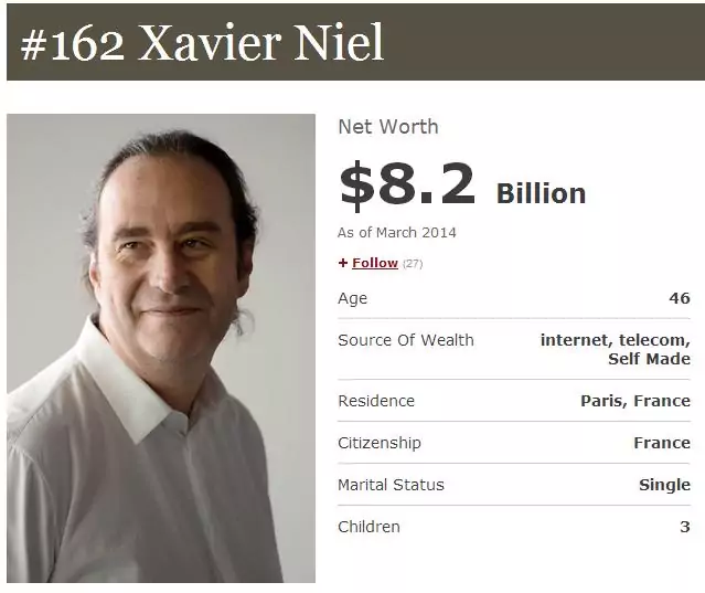 Forbes vient de publier son classement 2014 des hommes les plus riches du monde. On y retrouve Xavier Niel qui passe de la 179ème place mondial en 2013 à la 162ème place (chiffre de mars 2014). En France il est classé 8ème.